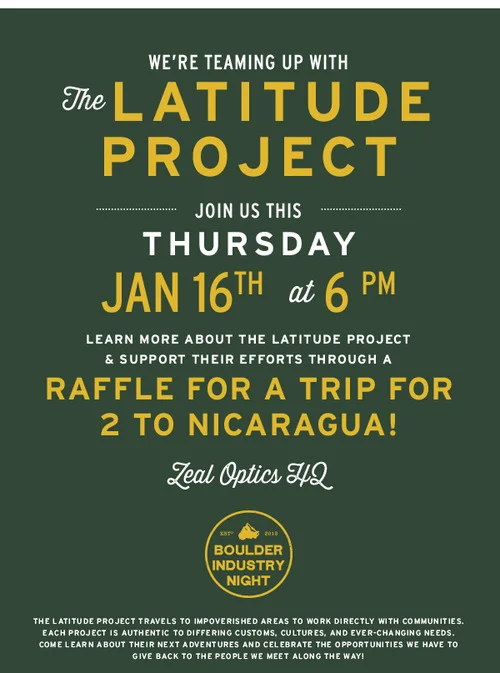 Join us at 6 pm at ZEAL Headquarters to learn more about The Latitude Project from founders Alanna & Jennifer Tynan, and support their cause, which helps rural communities in Central America by building schools and infrastructure, and enter for a chance to win a trip to Nicaragua!